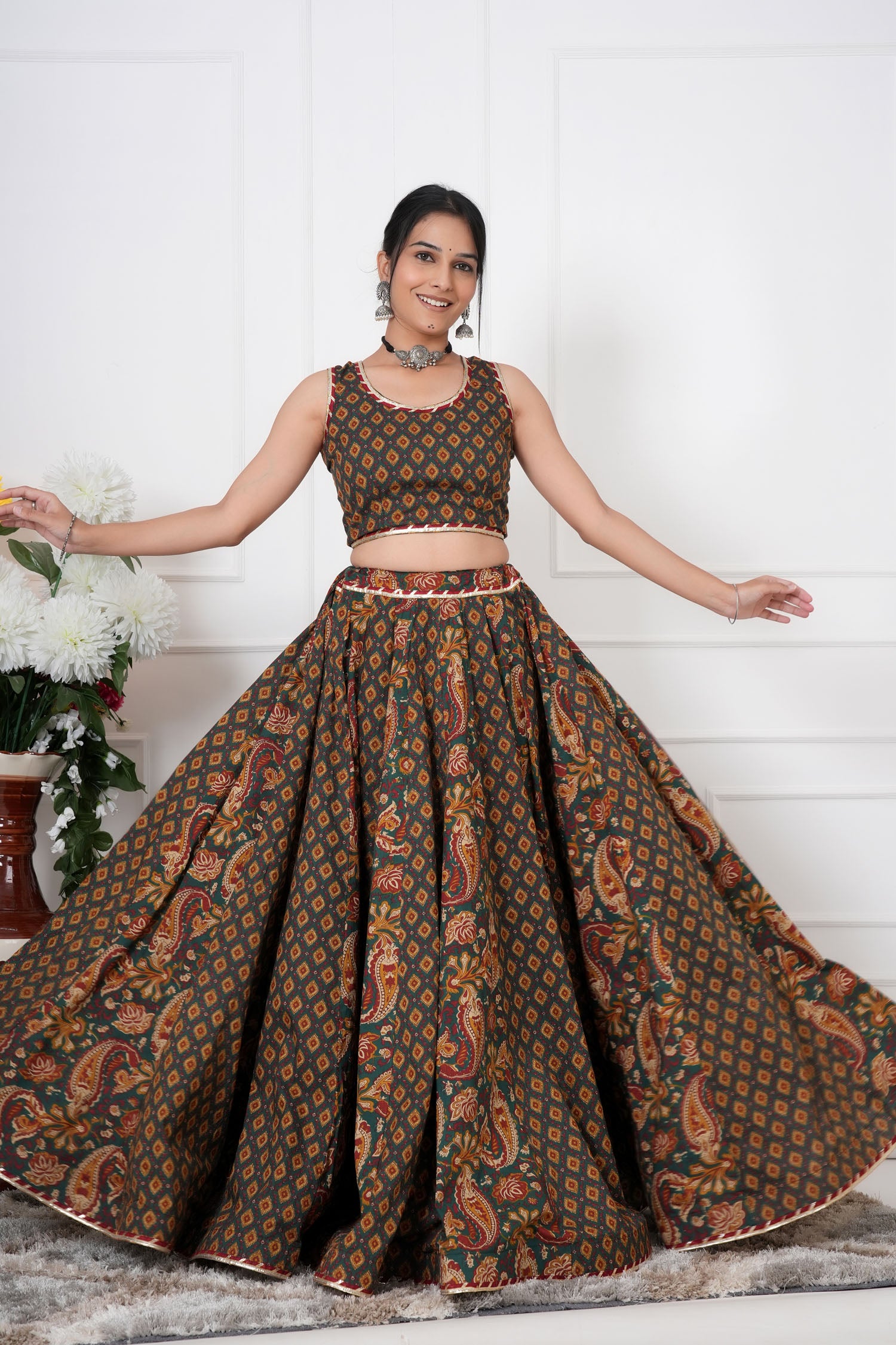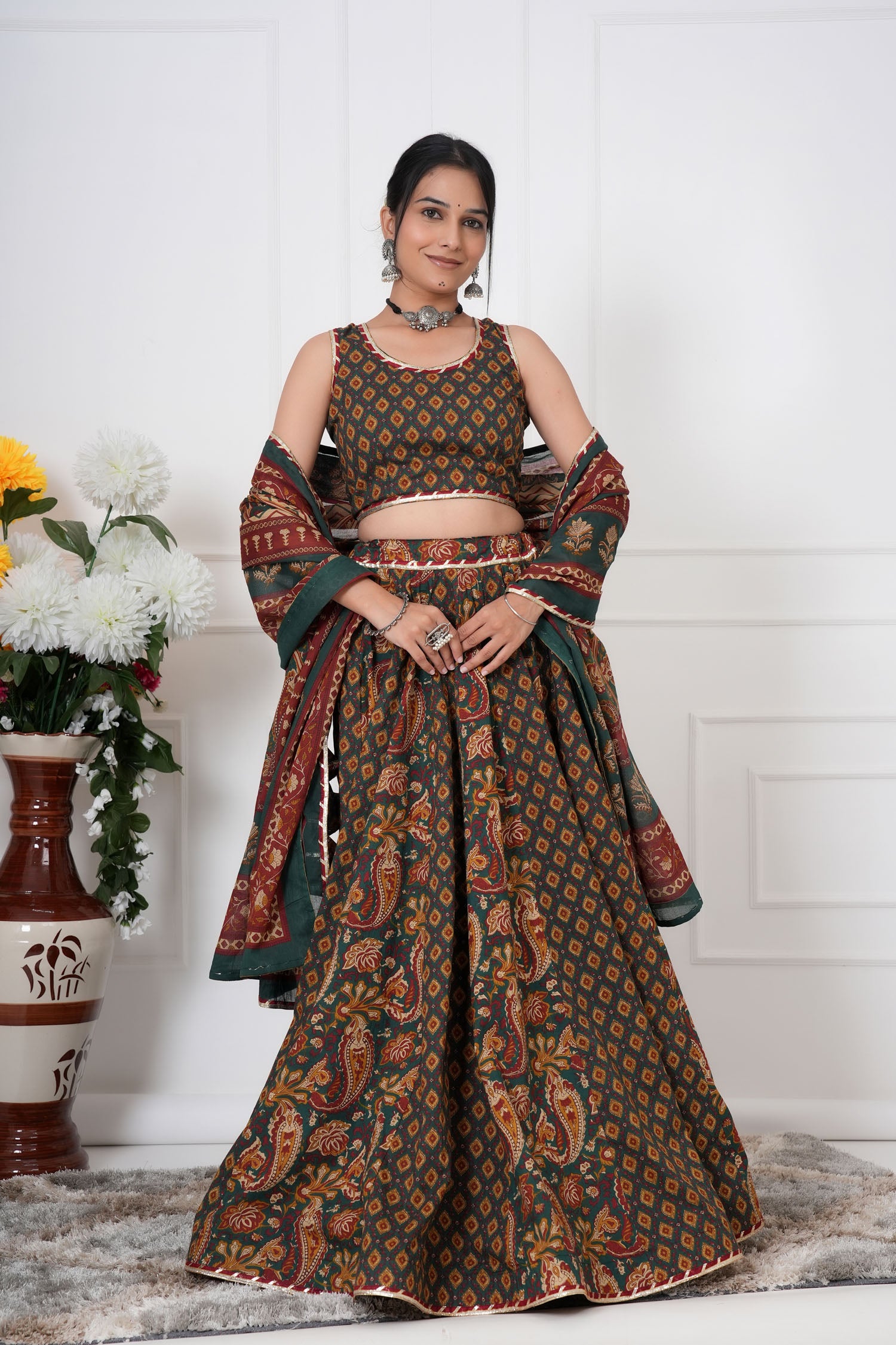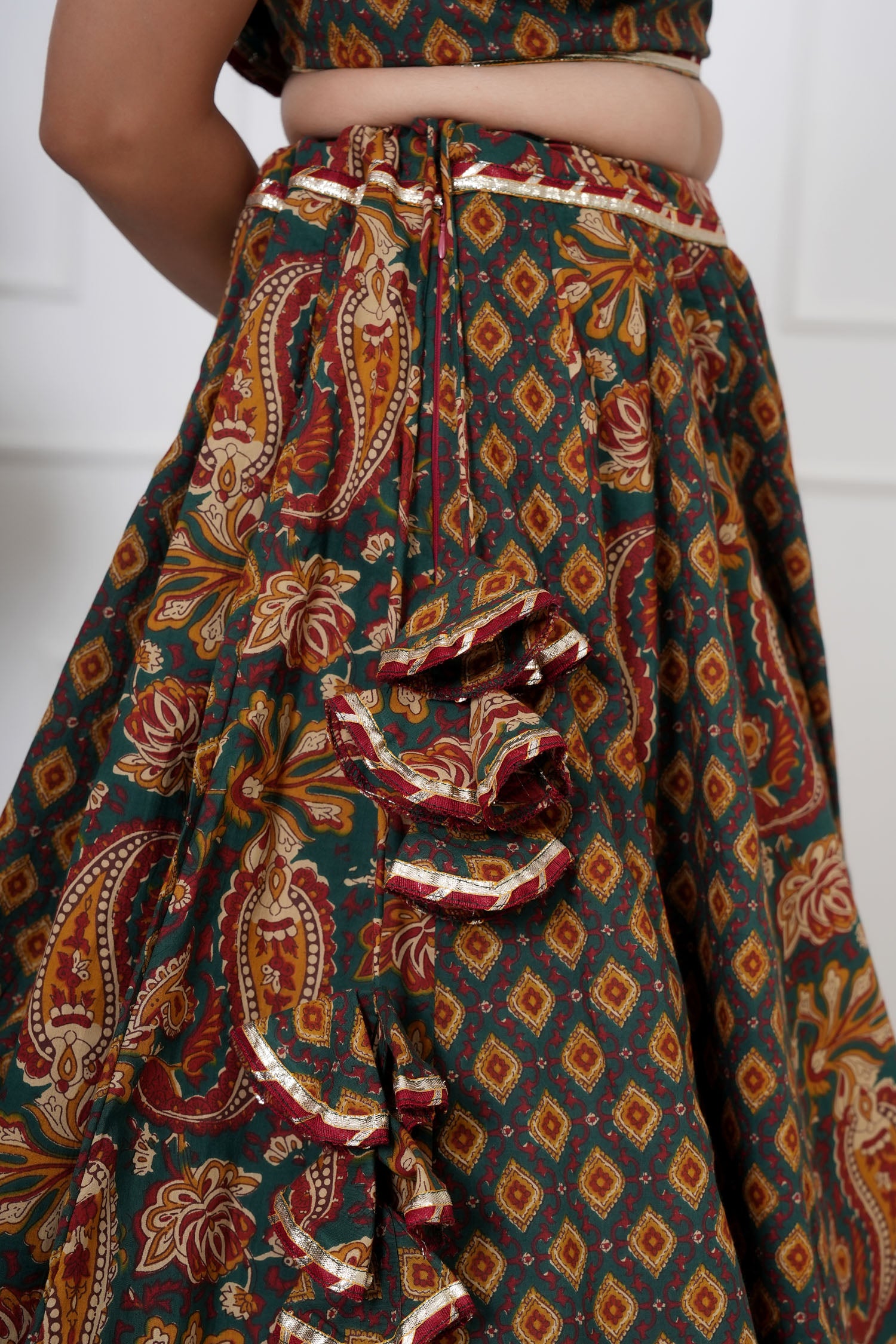 Amaira is a sleeveless lehenga set crafted from soft, breathable cotton, featuring elegant kalis, playful tassels, and intricate magji detailing on the neckline, sleeves, lehenga, and dupatta. Designed to flow gracefully while showcasing artisanal craftsmanship, this ensemble is perfect for weddings, festive occasions, or special celebrations. Amaira beautifully combines traditional detailing with a contemporary silhouette for an effortlessly striking look.