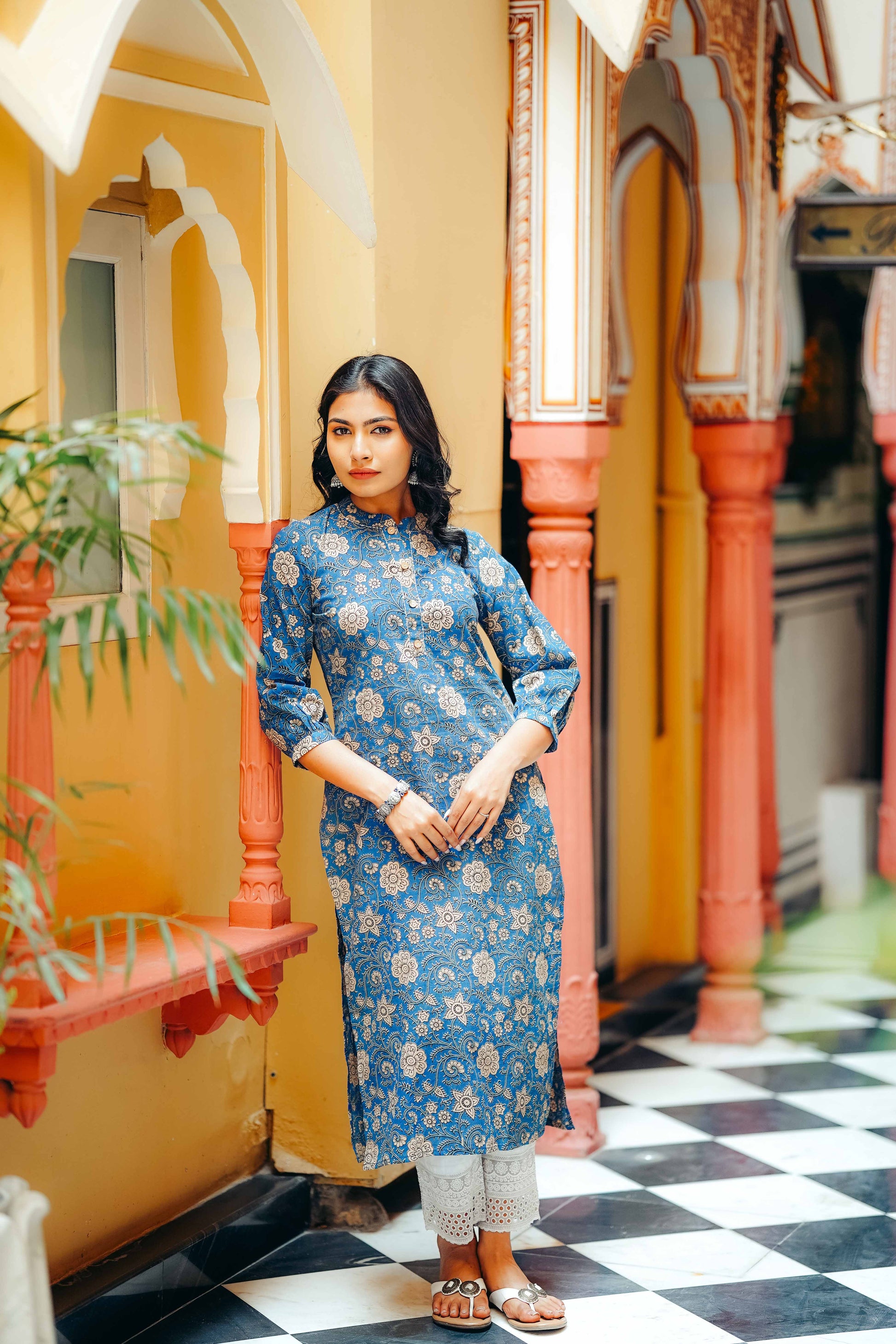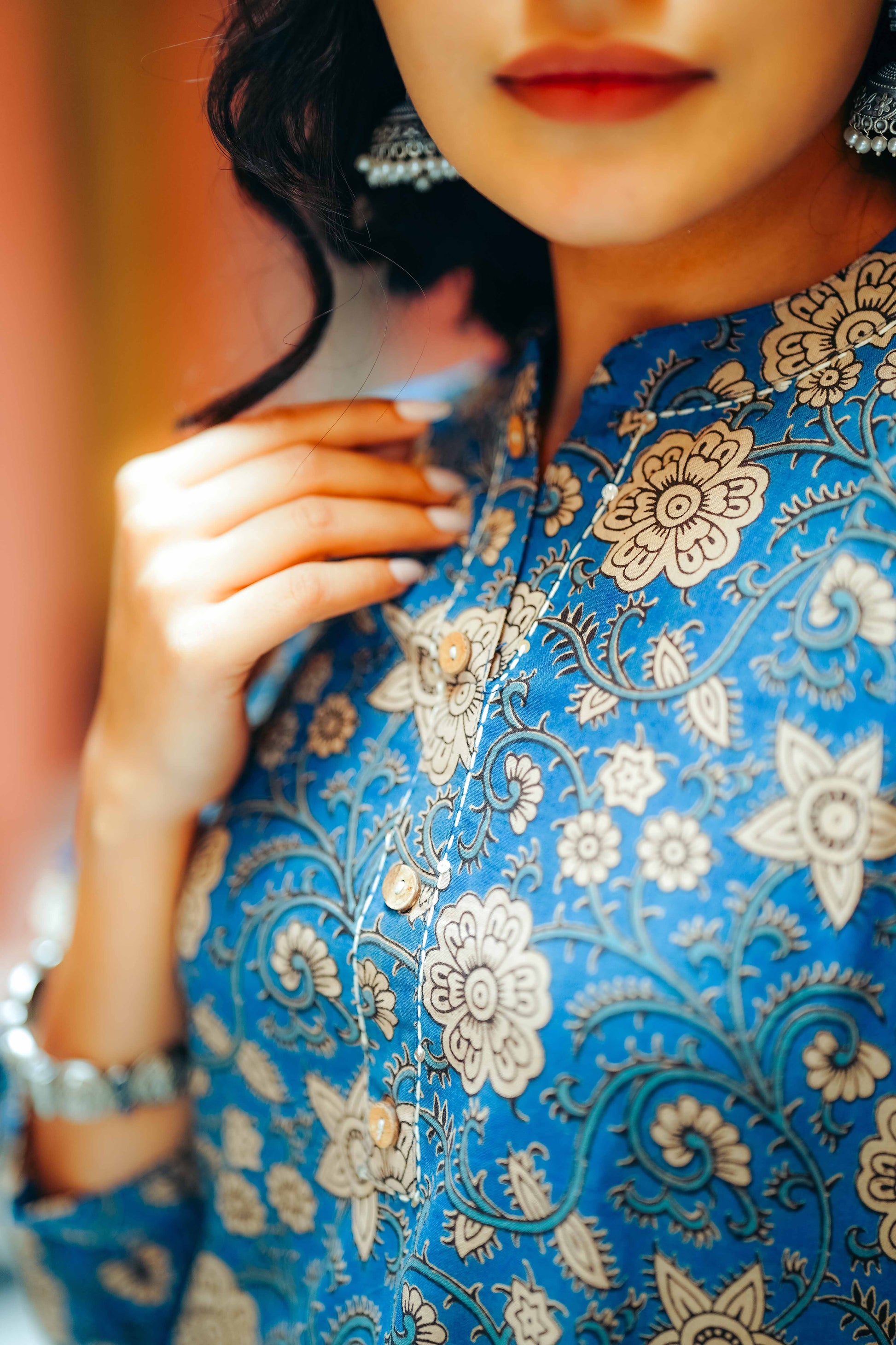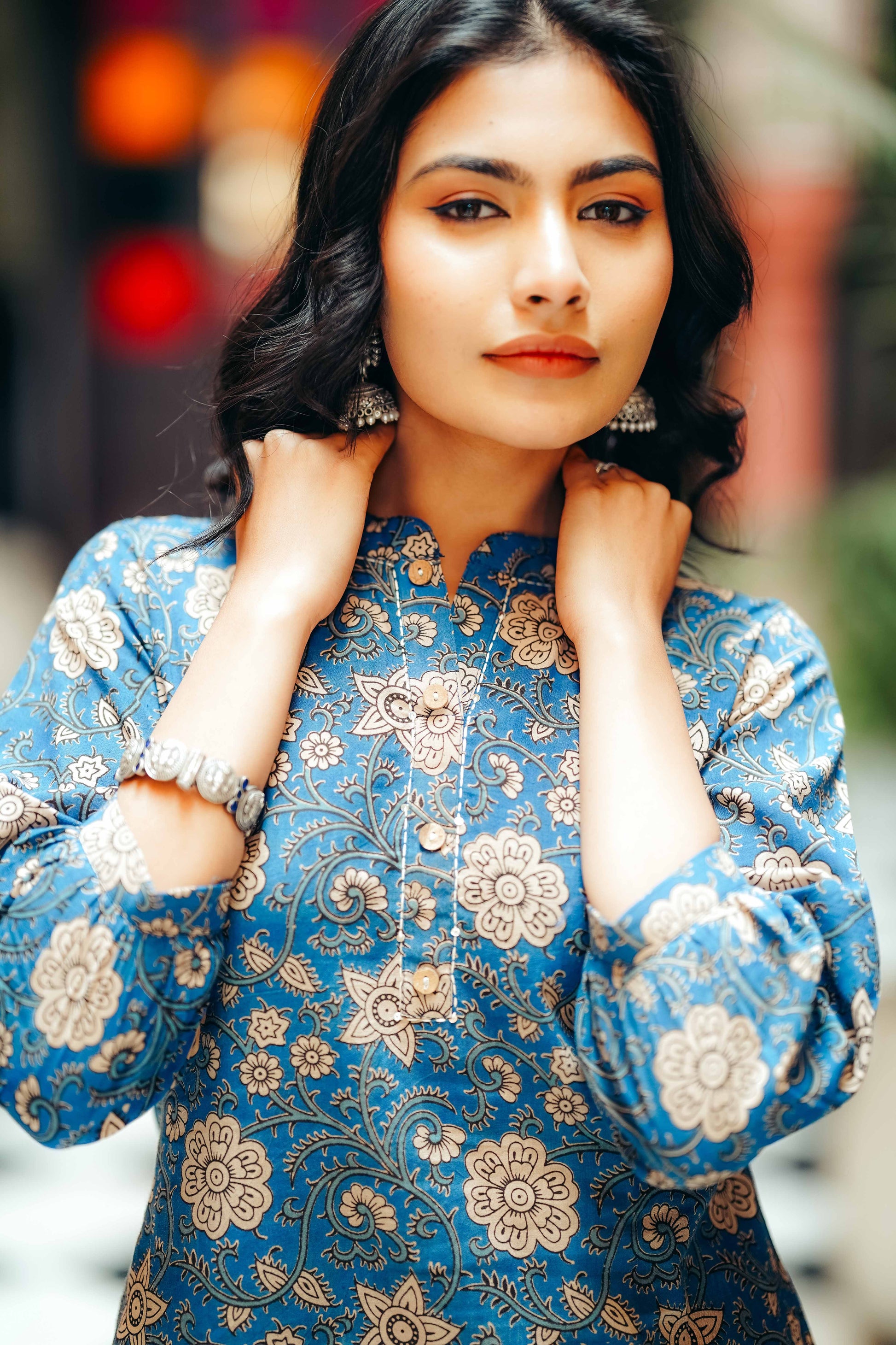 Falak is a straight cotton kurta crafted in traditional Kalamkari print fabric. Featuring a hand-embroidered neckline and 3/4th puffed sleeves, this kurta blends classic charm with modern comfort. Perfect for festive occasions, casual outings, or everyday ethnic wear.