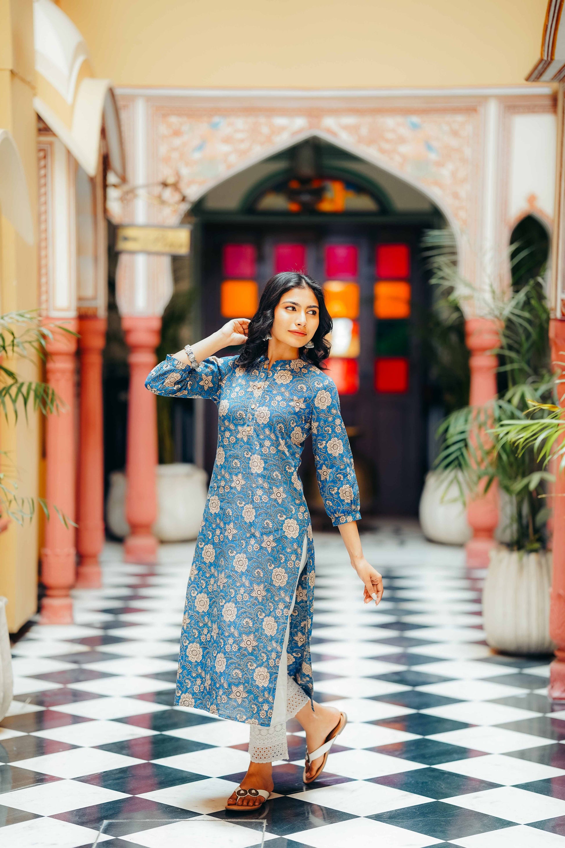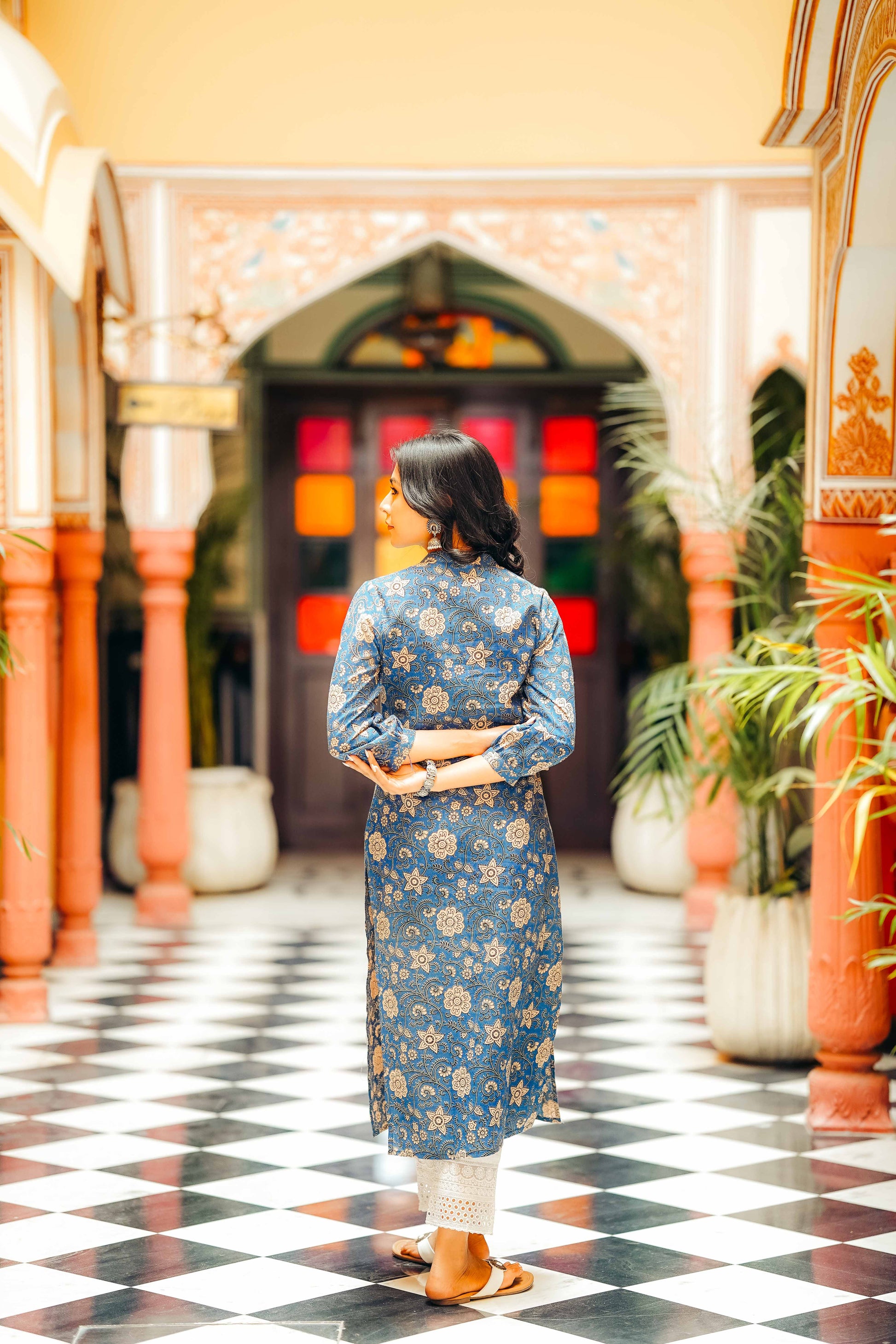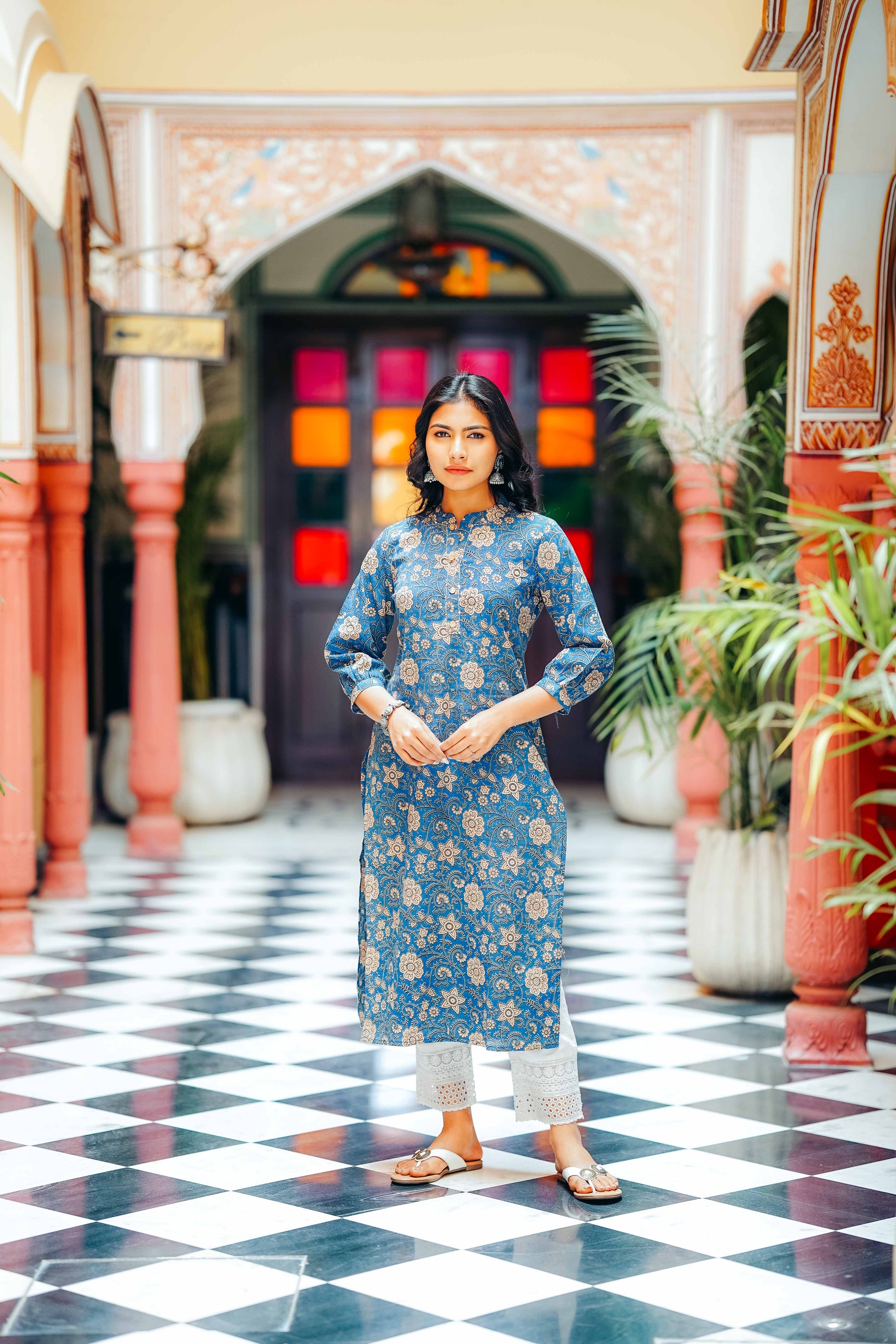Falak is a straight cotton kurta crafted in traditional Kalamkari print fabric. Featuring a hand-embroidered neckline and 3/4th puffed sleeves, this kurta blends classic charm with modern comfort. Perfect for festive occasions, casual outings, or everyday ethnic wear.