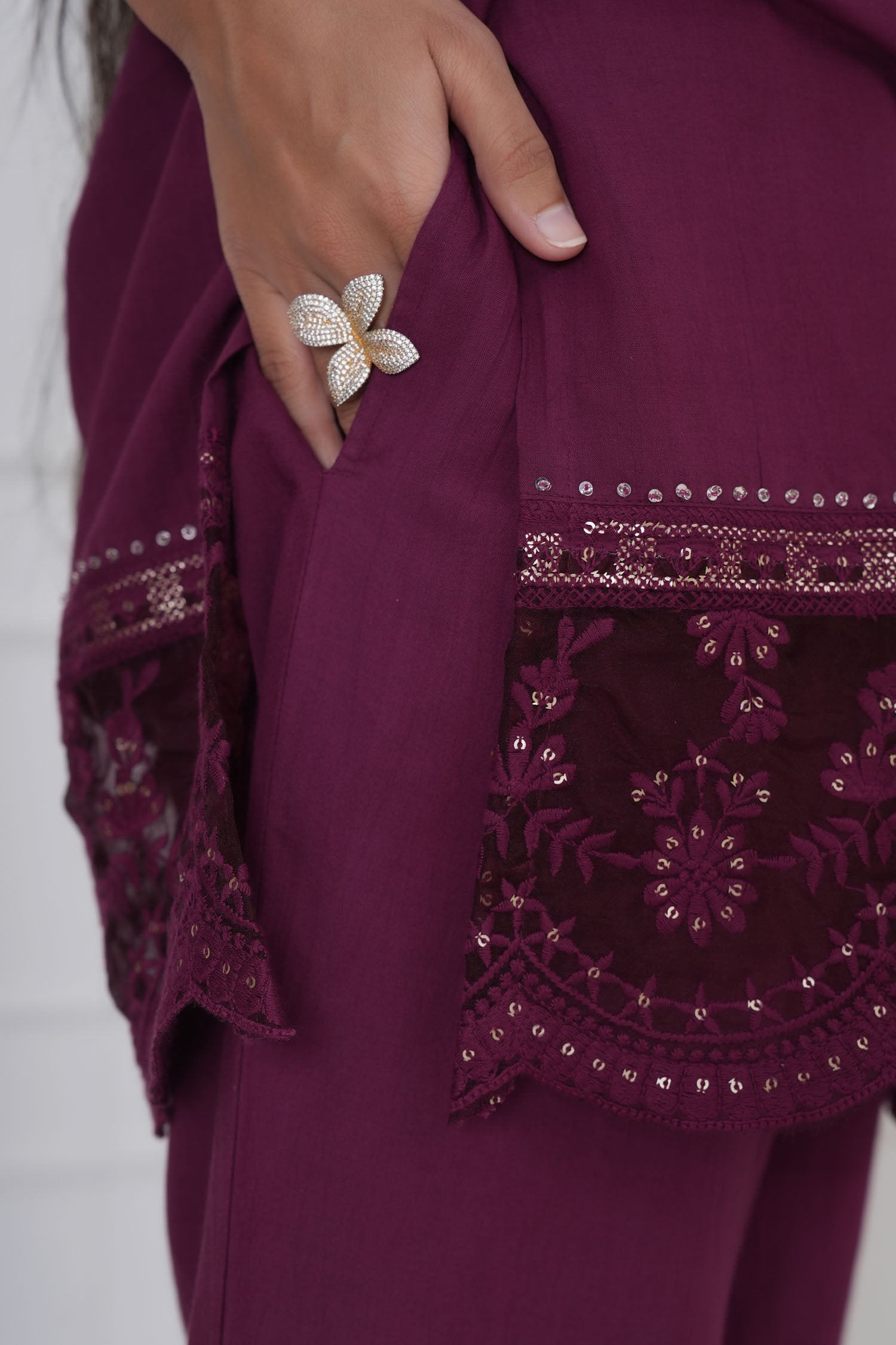 Embellishment: Hand embroidery on neckline, sleeves, kurti and pant bottom
