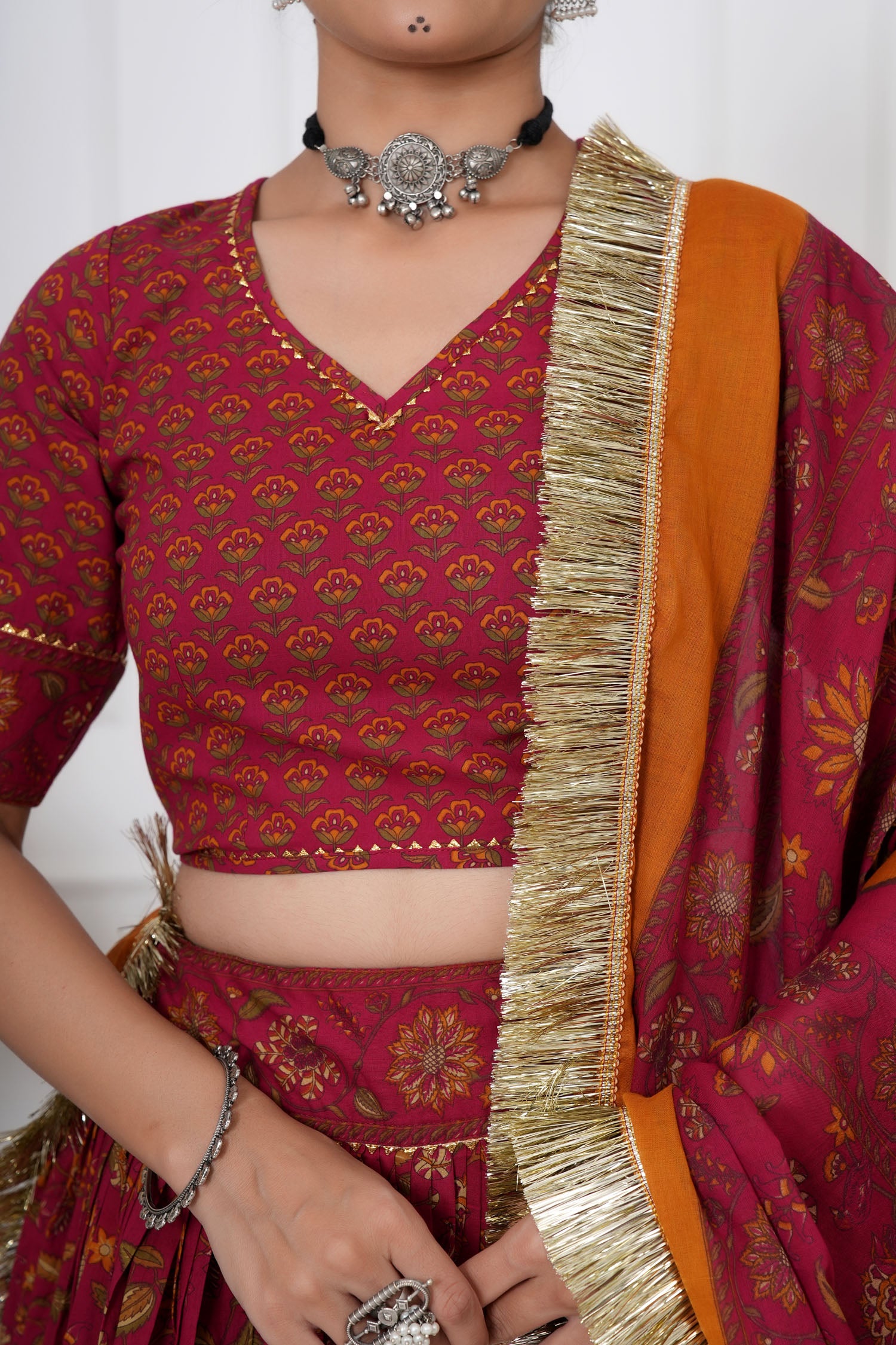 Embellishment: Bijiya lace detailing on neckline, sleeves, and lehenga; tassels on skirt